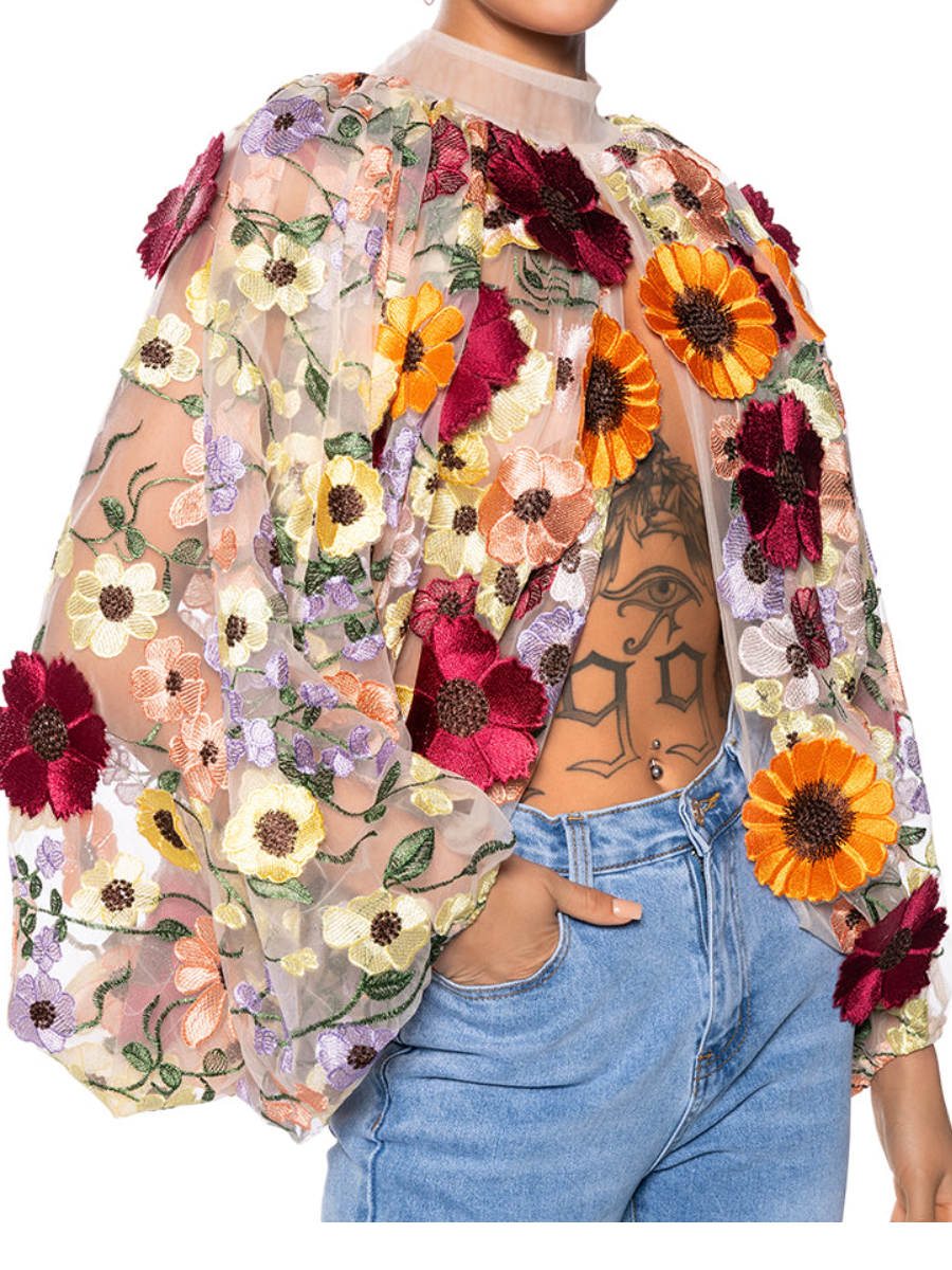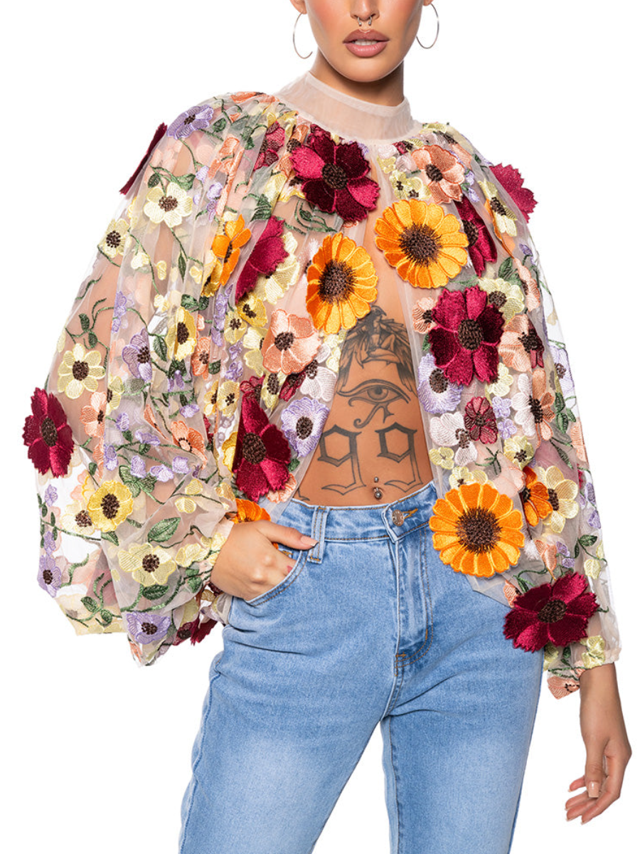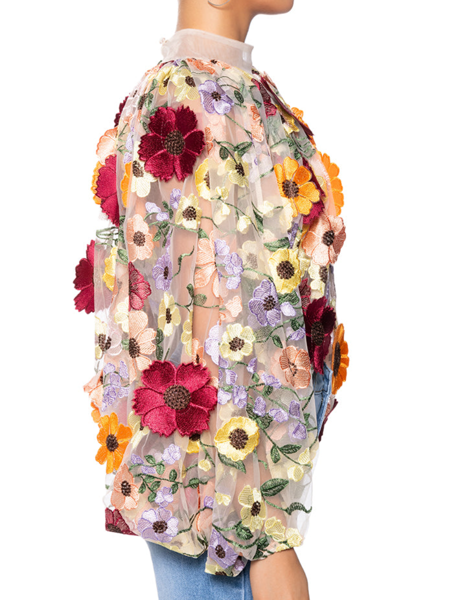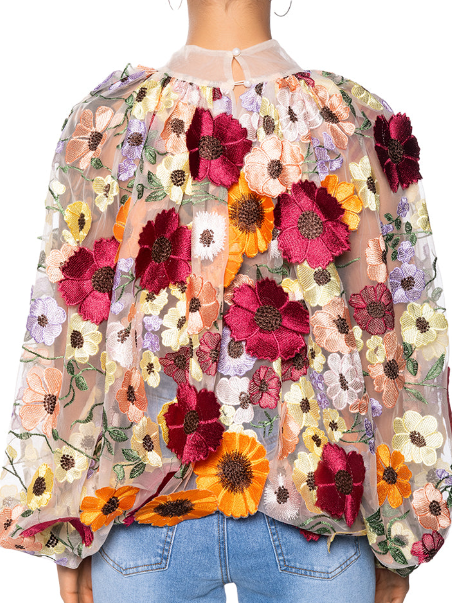 Tulle Mesh Embroidered Print Top